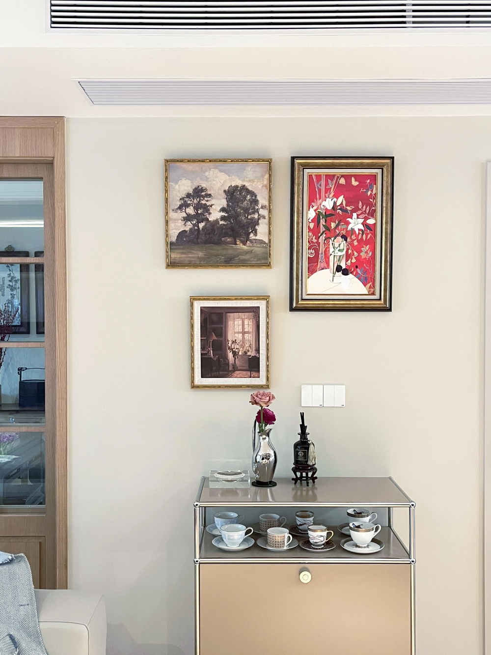 客厅沙发的背后是一间中式茶室,清雅而深沉,茶室内还有一块“价值不菲”的藏品展示区。