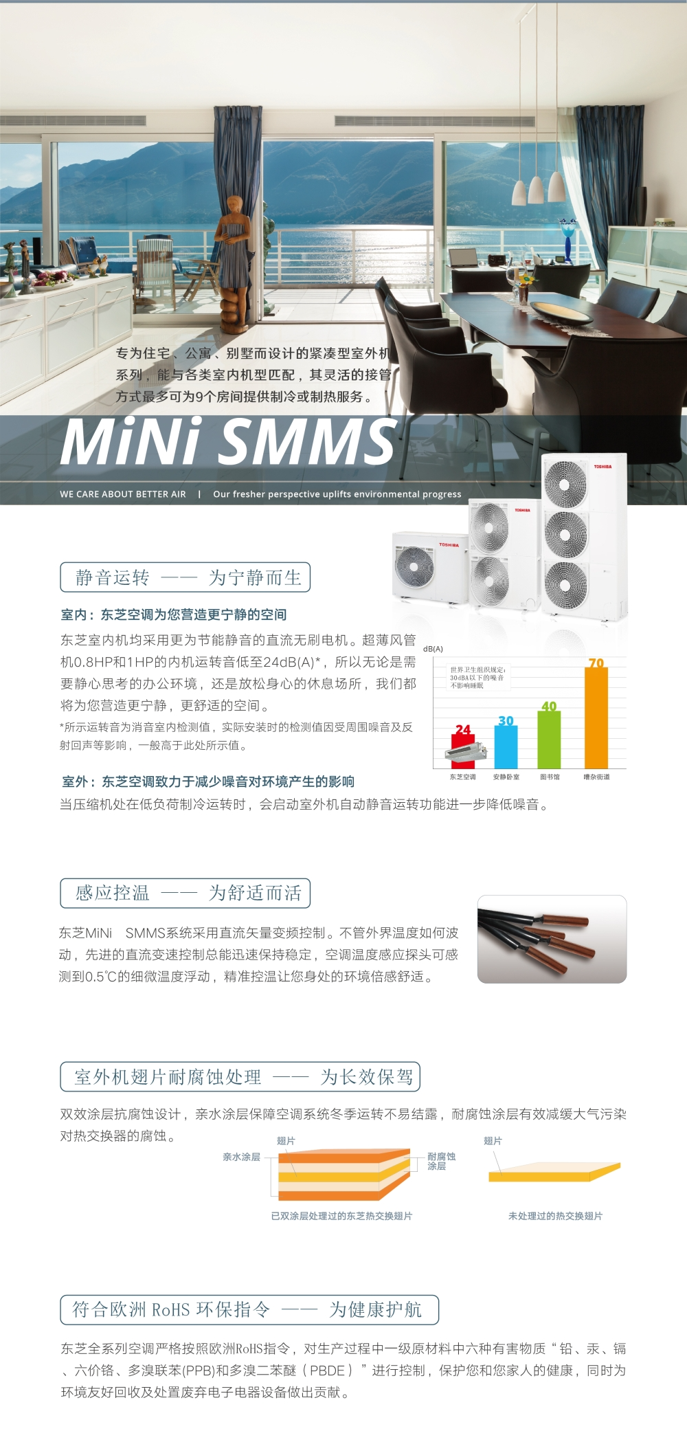 在保障舒适的同时,MiNi SMMS系列设计更灵活、安装更便利、空间更节约,狭窄的花圃角落即可满足室外机安装条件。作为首批获得康居认证的多联机空调系统,MiNi SMMS系列还兼顾了低能耗,高效率的优秀“品格”。