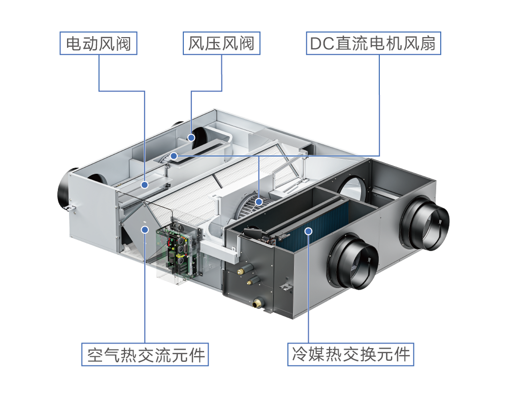机组内置双直流马达,使风量调节更精确,同时也降低了设备运转时的振动与声音。恒定风量模式下,确保设备在送风与排风过程中面临不同的压力损失时,也能以额定风量运行,满足舒适体感的需求。恒定功率模式时,则通过风量微调统一了送风与排风的风量,并使其以所需最小电力驱动直流电机,从而实现节能效果。
