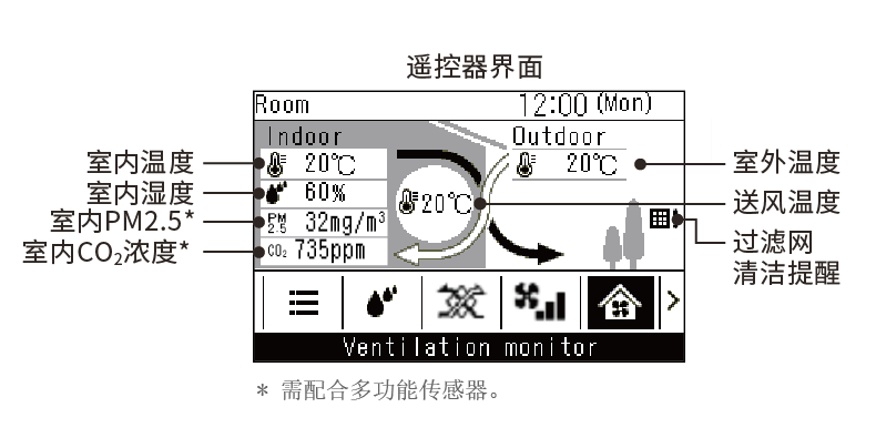 *3.可选配空气传感器及线控器RBC-AMSU52-E,实现空气可视化;如搭配线控器RBC-ASCU31VY-C亦可进行基础操作,但无空气可视化功能。