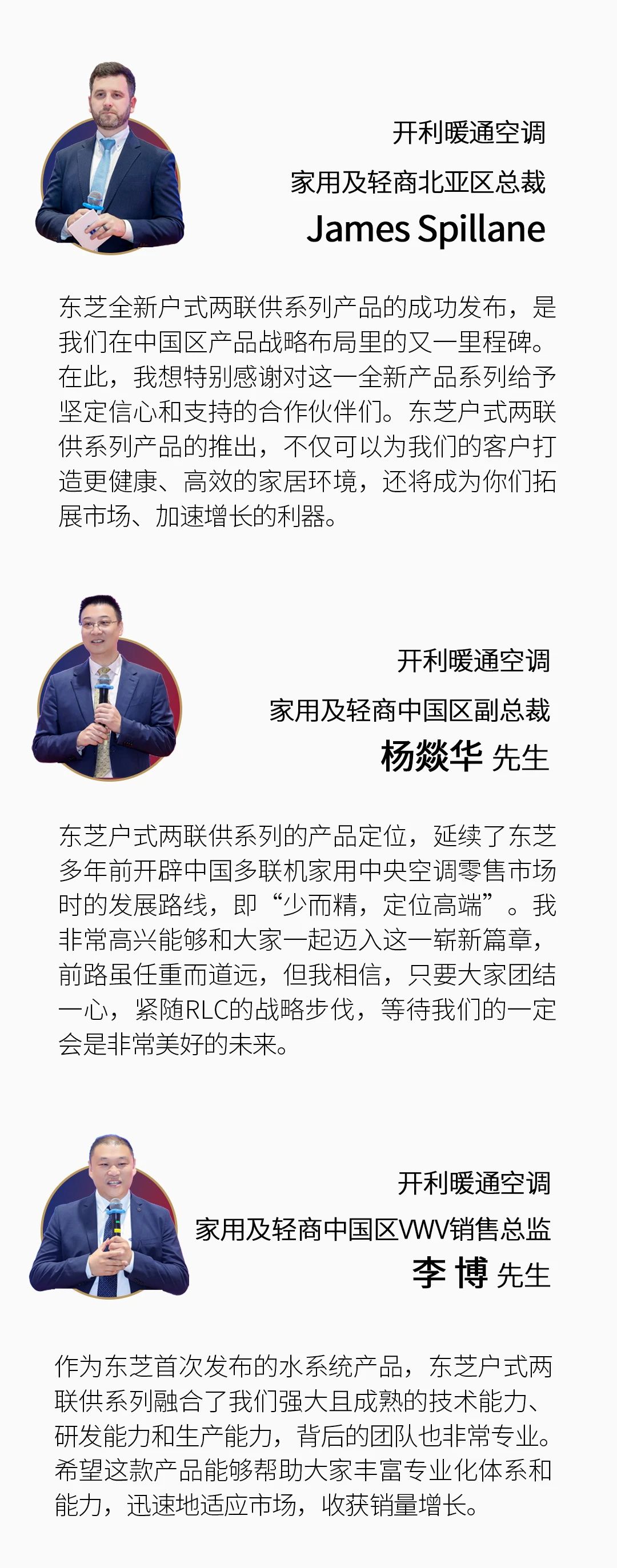 开利暖通空调家用及轻商北亚区总裁James Spillane、家用及轻商中国区副总裁杨燚华、VWV销售总监李博及几位合作伙伴代表共同为东芝户式两联供系列产品揭幕。