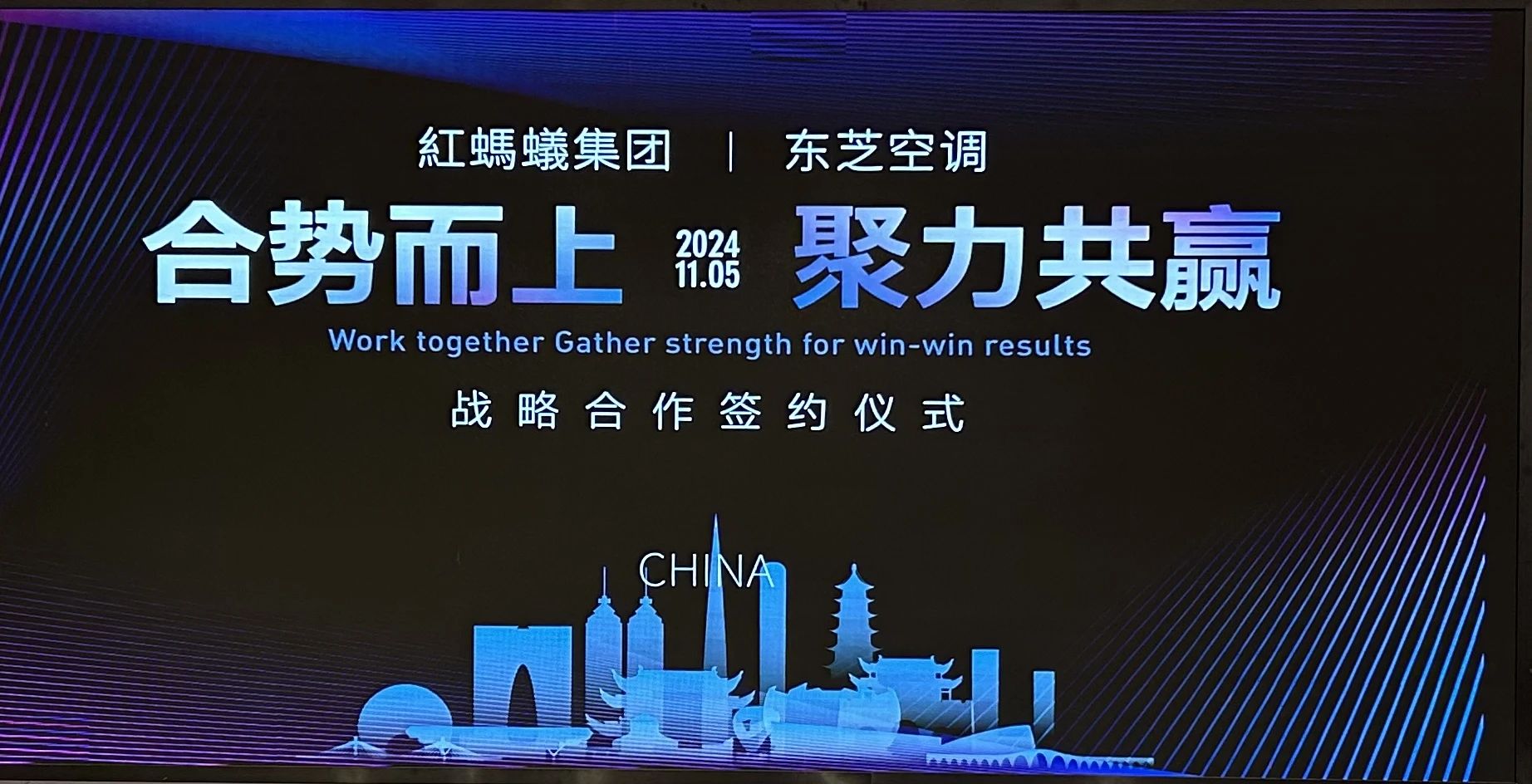 2024年11月5日,东芝空调与红蚂蚁装饰战略合作签约仪式在苏州顺利举行。开利暖通空调家用及轻商北亚区总裁James Spillane、中国区副总裁杨燚华、红蚂蚁集团董事长李荣等领导共同出席。