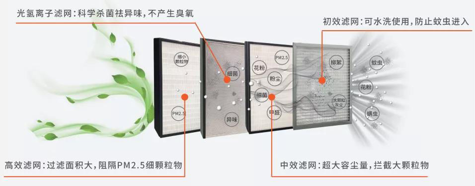 内置四层滤网,有效阻隔PM2.5、过敏原、细菌病毒颗粒,更配备光氢离子滤网,科学杀菌,全面祛除异味,不产生臭氧污染,进一步净化空气。