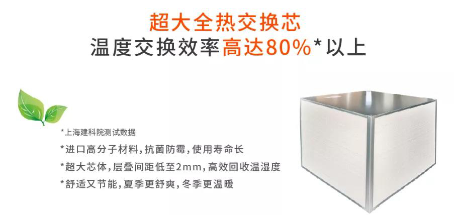 大尺寸进口全热交换芯体,层叠间距低至2.0mm,温度交换效率高达80%以上,高效回收空气中的温湿度,让新风的温湿度更加适宜人体,也为小业主节省夏天开冷气、冬天开暖气的空调电费。