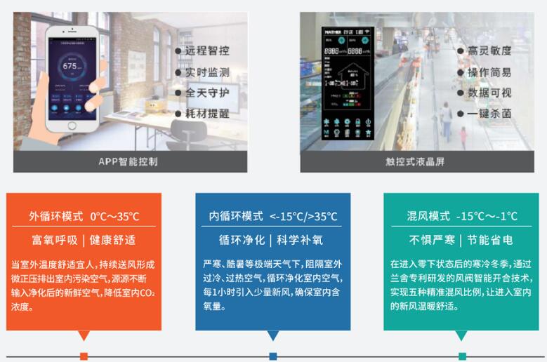 触控式液晶屏实时显示空气质量,兰舍新风APP支持远程智控。
