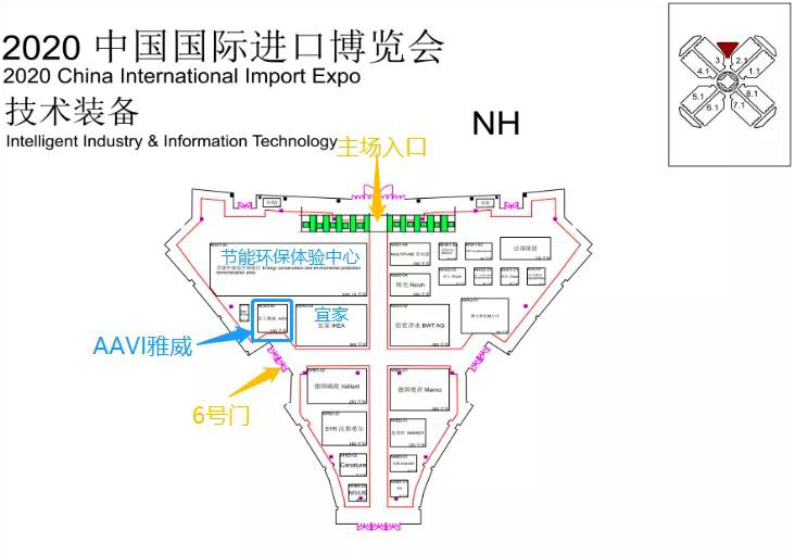NH馆内包括综合体验区和独立展台两个部分,AAVI雅威属于独立展台,紧挨节能环保综合体验区,并与全球知名跨国企业宜家为邻,旁边即是NH馆6号门入口。